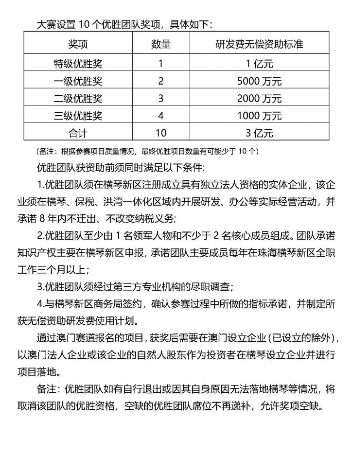 一、大赛介绍 为进一步打造创新发展活力,横琴新区决定自2018年起每年举办一届面向全球的创新创业大赛,重点支持取得先进创新成果,实现关键技术突破。聚焦集成电路和芯片设计、大数据和人工智能、生物医药和医疗器械、新材料四大行业领域,吸引符合横琴产业发展方向、有突破性原创技术的优胜团队落户横琴。 第二届大赛于2019年12月10日启动报名,评审过程将先后设置资格审查、初赛、实地考察、决赛、总决赛等环节,其中,大赛的初赛、实地考察及决赛环节专设澳门赛道,符合条件的澳门团队可以选择澳门赛道报名参赛。 二、组织机构 主办单位: 珠海市横琴新区管理委员会 澳门特别行政区科学技术发展基金 承办单位: 横琴新区党群工作部 横琴新区商务局 三、参赛领域 集成电路和芯片设计,大数据和人工智能,生物医药和医疗器械,新材料。 四、报名条件 参赛项目需同时符合以下基本条件: 1.项目具有创新性和高成长潜力。大赛优先考虑取得先进创新成果,实现核心关键技术突破,具有良好产业化前景的创新创业团队; 2.参赛项目的产品、技术及相关专利归属参赛团队,无产权纠纷; 3.参赛团队具有来横琴发展的真实意向,且参赛项目具备落户横琴的可行性。 4.参赛项目以企业为主体参赛。 备注:获得首届中国横琴科技创业大赛前十名的优胜团队,不得重复参赛。 五、澳门赛道设置 大赛在初赛、决赛环节专设澳门赛道。澳门赛道参赛项目在初赛、实地考察和决赛三个环节中单独排序。大赛进入总决赛环节后,不再单设澳门赛道。 澳门赛道参赛团队除符合基本条件外还需符合以下条件之一: 1.在澳门特别行政区合法登记成立的企业; 2.项目创始人或核心团队成员之一为澳门永久性居民; 3.项目与在澳门设立的国家重点实验室有合作背景(提供该项目在大赛报名截止日仍在有效期内的合作协议); 4.项目创始人或核心团队成员之一为澳门登记注册的高校/科研机构在职教研人员或全日制在校学生; 5.被澳门企业直接或间接投资,且穿透计算所占项目股份比例不低于10%(此处澳门企业指在澳门登记设立且实际控制人为澳门永久性居民的企业)。 六、赛事安排